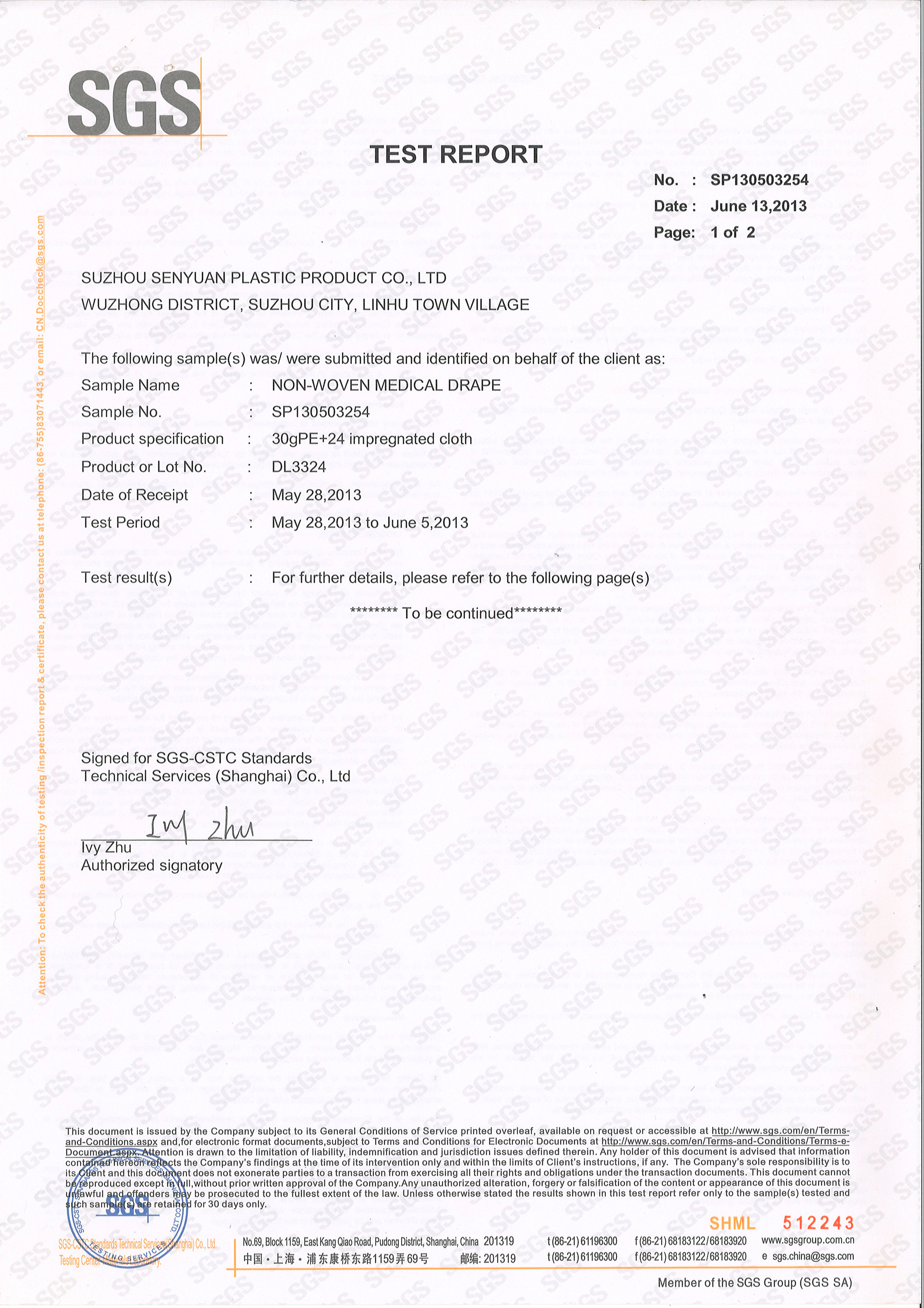 SGS impregnated কাপড় কম্পোজিট পরীক্ষার রিপোর্ট DL3324